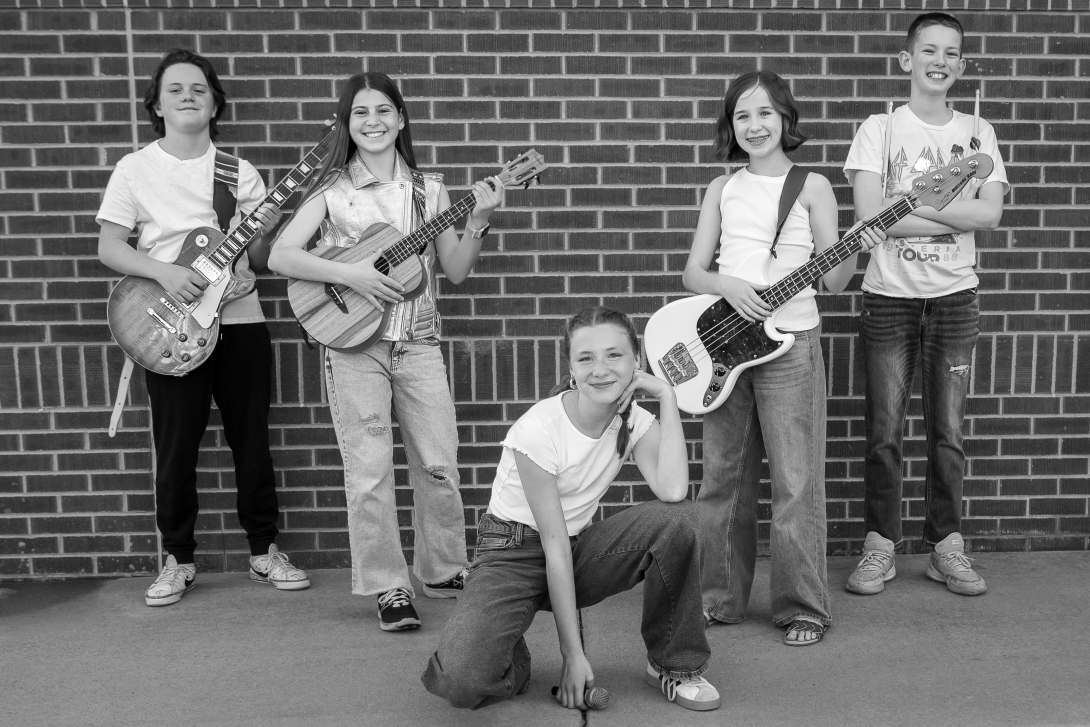 The band features Emily George, whose bluesy voice carries stunning range and emotional depth. Natalie Leslie brings true musical versatility, contributing vocals, piano, bass, and baritone ukulele. Max Riojas anchors the band on drums with impressive mastery and feel, and has the ability to play any genre. Sebastian Pettit brings remarkable skill on both electric and acoustic guitar, confidently handling intricate riffs and expressive playing. Rounding out the group is Agnes Giuliani on bass, guitar, and baritone ukulele, whose fingerpicking talents are unparalleled. Each of these students can play multiple modern band instruments and are also classically trained, playing the piano or instruments in orchestra or band.